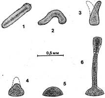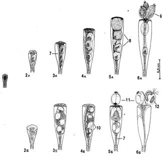 пульсируя, оседает, увеличивая площадь прикрепления, 5 — полностью