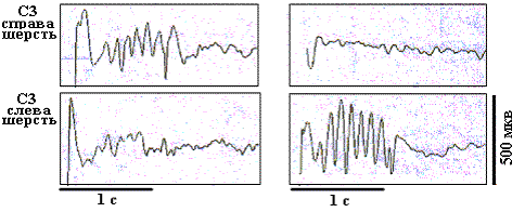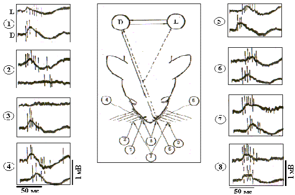 проявляемостью реакций, а контралатеральное - не включает нижние ряды вибрисс.