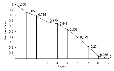 – 9 лет. Величина выживания, специфичная для каждой возрастной группы, остается