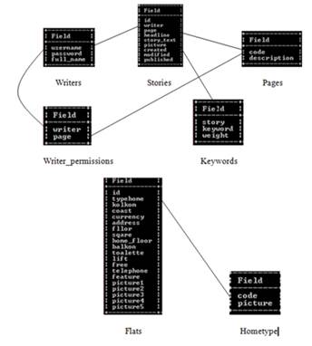 Writers, Stories, Pages, Writer_permission, Keywords, Flats, Hometype (рис.