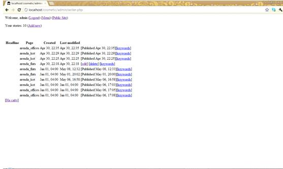 актуальных статей и предлагает опции добавления новой статьи, редактирования