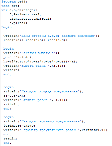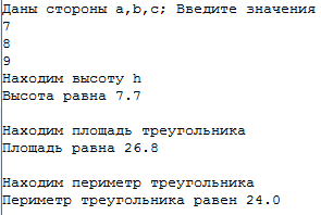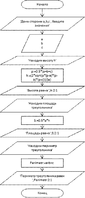 градусах); h - высота, опущенная на сторону с; S - площадь; Р - периметр