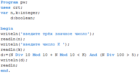 Сумма двух последних цифр заданного трехзначного числа N меньше заданного