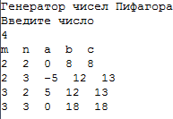 программу-генератор чисел Пифагора а, b, с (с2 = а2 + b2). В основу