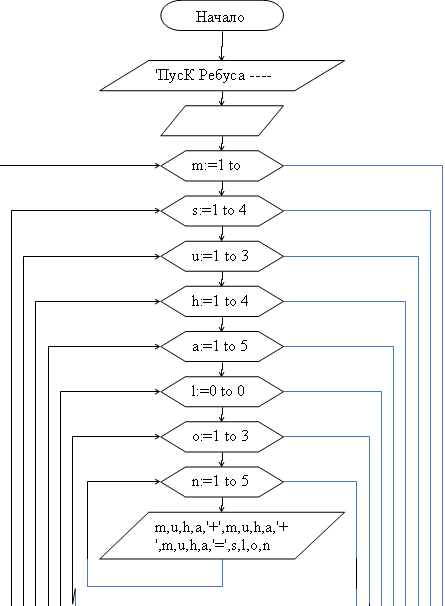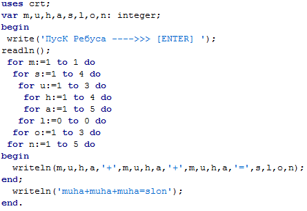 Составить алгоритм решения ребуса МУХА + МУХА + МУХА = СЛОН (различные