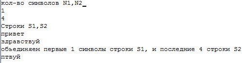новую строку, объединив N1 первых символов строки S1 и N2 последних символов