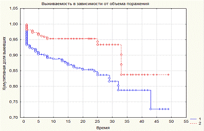 зависимости от объема поражения (Рисунок 3.Б), разделенных по отношению к