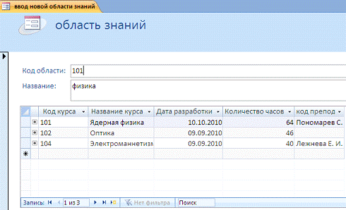 таблиц «Область знаний» и «Список курсов» («Занятия») осуществляется по