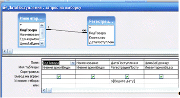 дату]», сохраняем запрос с именем «Товары поступившие на склад после даты»,