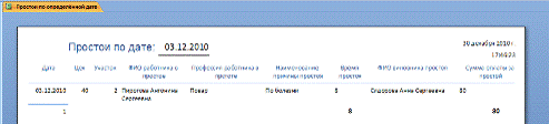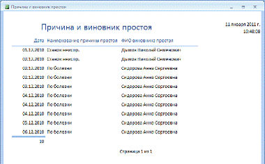 распечатать информацию о причинах и виновниках простоев с указанием даты