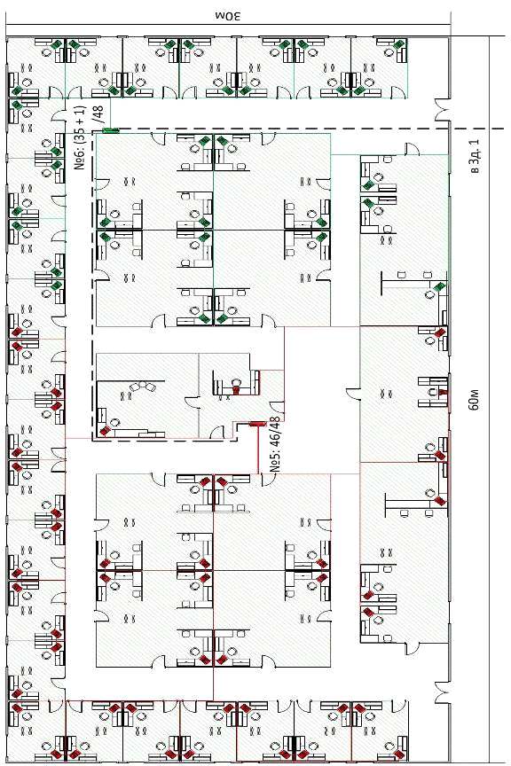 Спроектированная сеть объединяет 3 здания, построена на основе топологии