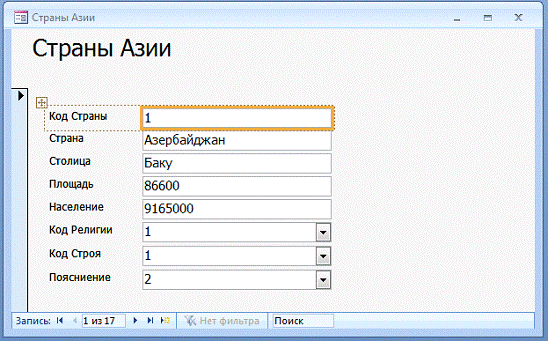 таблице «Религии» с кодом строя в таблице «Страны» надо перетащить мышкой это