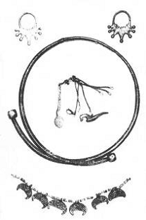 также шерстяной тесьмой, украшенной медными височными кольцами.