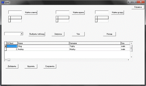 клиента", "Найти услугу" предназначены для поиска ID врача,