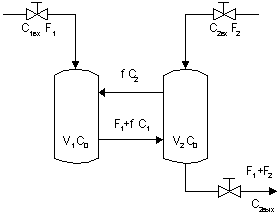 зависимости концентрации С1 и С2 в обеих ячейках от входящих потоков F1, F2, потока перемешивания f, концентрации растворенного вещества во входящих потоках C1вх и C2вх и в начальный момент времени С0.