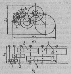 Рис. 2. Схема многоступенчатой зубчатой передачи: а) расположение валов;