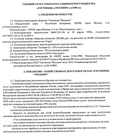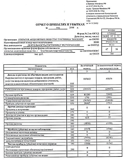 Отчет о прибылях и убытках ОАО «Гостиница Москвич» за 2008 г.