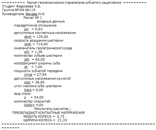 По программе определяется модуль передачи и ширина зубчатого колеса.