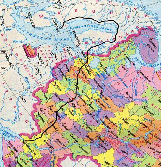 1- сухопутный. Проходит по территории РФ, Финляндии и Швеции.