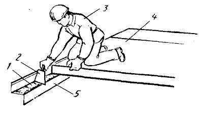 растворная постель, 2 - кельма, 3 - 1-й монтажник, 4 - смонтированная панель, 5