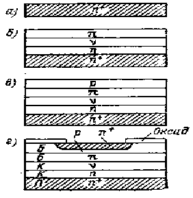 диф фузионной p -базы; г -окисление и диффузия (формирование n+ -эмиттера); П -