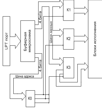 Принцип работы схемы состоит в следующем: шину данных LPT порта (8 бит)