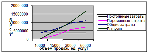 безубыточности достигается при объеме продаж 25000 единиц услуг, после этой