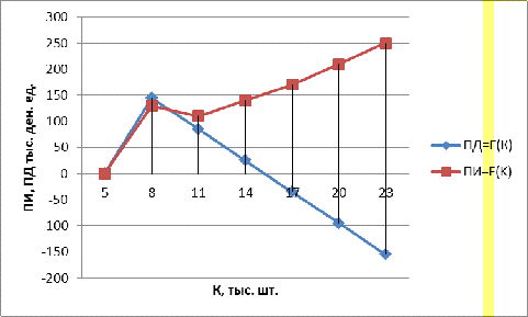 ден.ед. при К = 23 тыс. шт. (см. приложение, график ПИ=F(K))