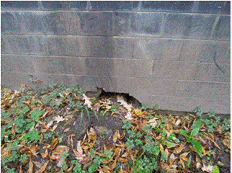 основание фундамента. В увлажненном месте видны трещины в кирпичной кладке, на