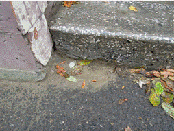 плитки крыльца здания, разрушение кирпича, многочисленные трещины межкирпичных