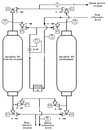 плотность закрытия, открываются запорные вентиля 1,2 адсорбера на входе
