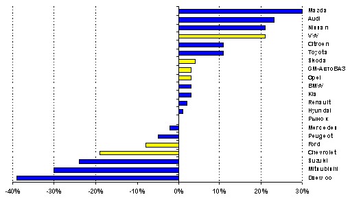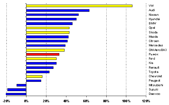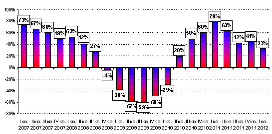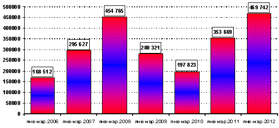 Изменение объемов продаж в 1 кв. 2012 г. по
