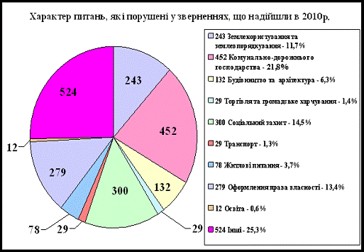 Кругові діаграмми, питань порушених у зверненнях: а) 2010 року;