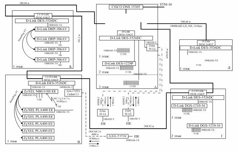 первого установлены коммутаторы D-Link. В зданиях Б и В сеть построена при