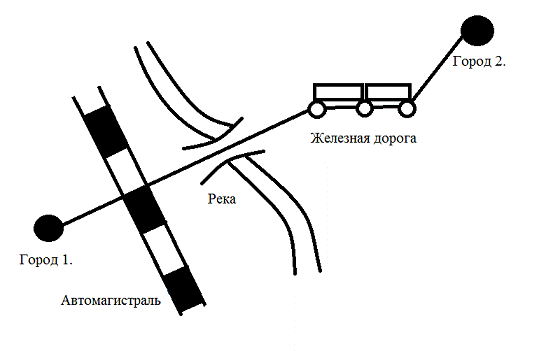 проходит двухпутная железная дорога, на расстоянии l2=390 км - автомагистраль с шириной h1=32 км. На расстоянии l3=480 км имеется водная