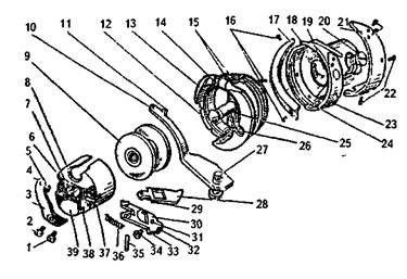 между стенками шпульки 24 и удерживает шпиндель 23 в рабочем положении.