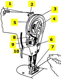 наконец, вводят в ушко иглы 7. При заправке нитки, оставляют свободный конец