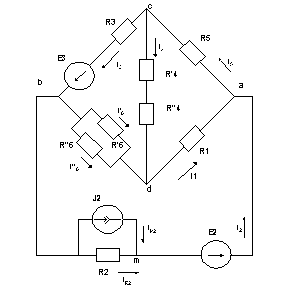 I1 = 3 A; I2 = 2,4 A; E1 = 70 B; E2 = 20 B; R1 = 8 Ом; R2 = 5 Ом.