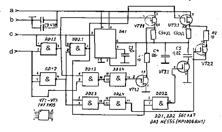 Двухтактный генератор построен на таймере DA1. Частота колебаний определяется