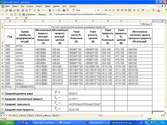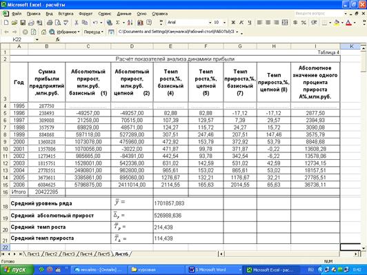 Расчёты показателей анализа динамики