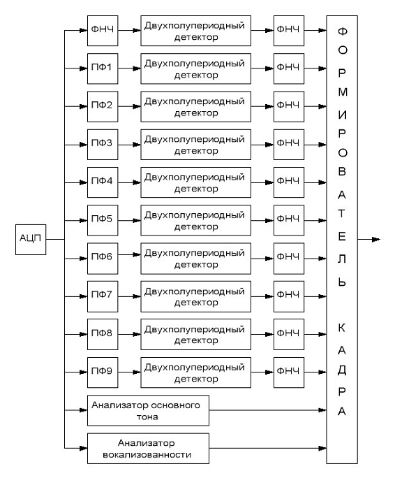 реализация цифрового полосового вокодера использованием БИХ-фильтров(Рис.1).
