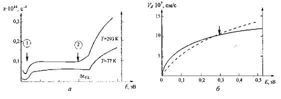 скорости в Si для температуры 293 и 77 К; на вставке изображена зависимость