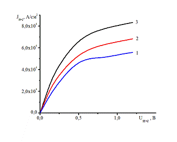 Рис. 2.6 Распределение электронов в транзисторе при трех напряжениях на