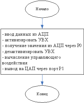 вычисление управляющее воздействие по заданному закону и вывод на ИУ.
