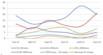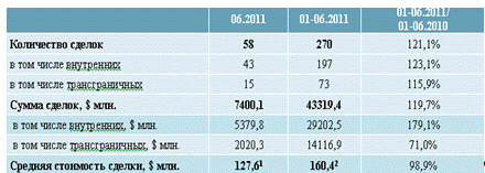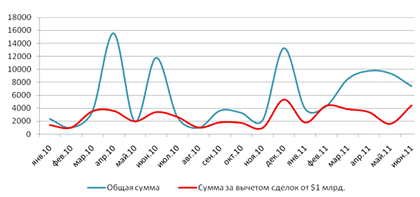 слияний и поглощений в июне 2011 года несколько выросла по сравнению с маем.
