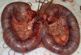 серозно-геморрагическим экссудатом. Из матки выделяется жидкость шоколадного