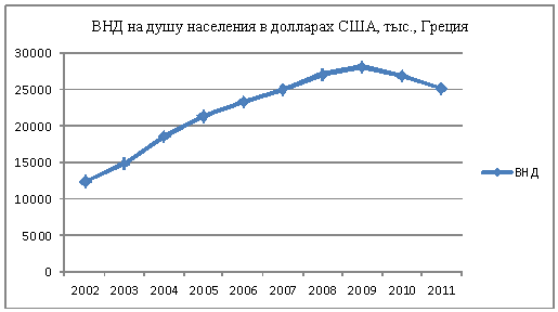 2 - ВНД на душу населения в долларах США, тыс., Греция, 2002 - 2011 гг.