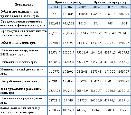 прогнозируемые значения 2004, 2006 и 2009 года для объема производства с