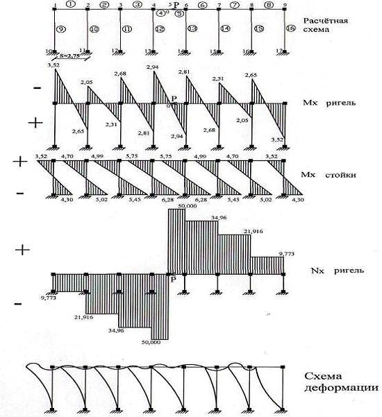 эпюры внутренних усилий. При этом в опасных сечениях балки и стоек возникают
