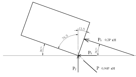 силы взаимодействия в зоне контакта Рх=24,3 кН, Ру=24,3кН и соответствующие им